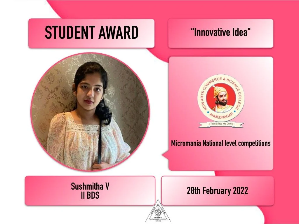 Award for Innovative Idea - Ms.Sushmtha V, II year BDS, at Micromania National Level Competitions, 28.02.2022