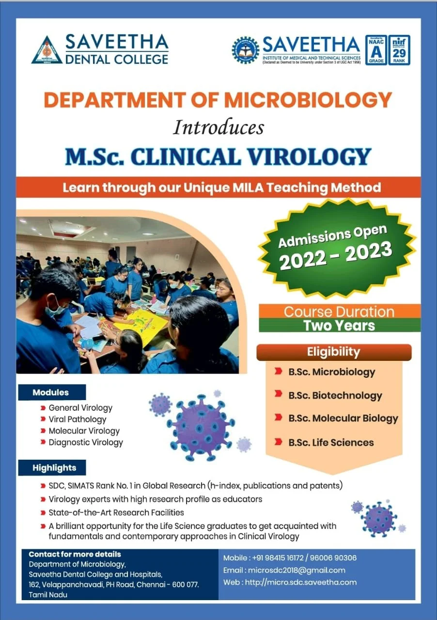 Department of Microbiology introduces M.Sc. Clinical Virology Course. Admission is now open for the year 2022-2023. Contact us for more details.