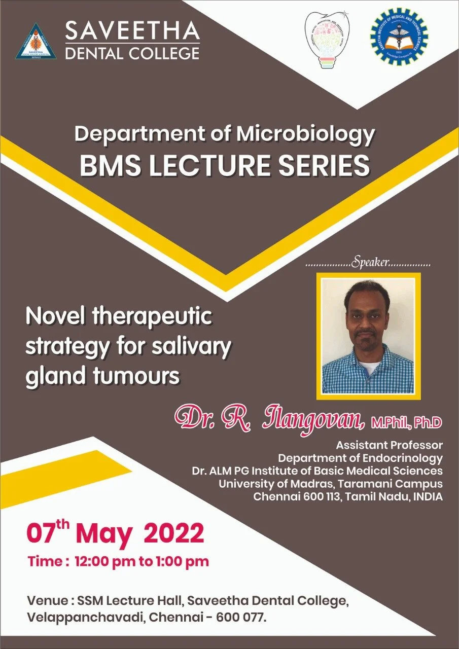 DEPARTMENT OF MICROBIOLOGY - BASIC MEDICAL SCIENCES LECTURE SERIES May 7 Written By Saveetha Microbiology Novel therapeutic strategy for salivary gland tumours Dr.R.Ilangovan, Assistant Professor, Department of Endocrinology, Dr.ALM PGIBMS, University of Madras, Taramani Campus, Chennai-6000113. Saveetha Microbiology