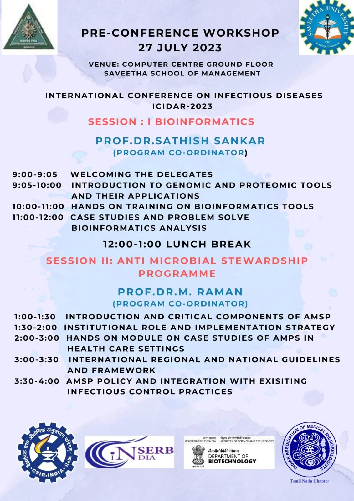 Preconference Workshop Jul 27 Written By Saveetha Microbiology Department of Microbiology, Centre for Infectious Diseases organises Pre-conference Workshop on Bioinformatics and Antimicrobial Stewardship Programme on 27.07.2023 at Computer Centre ground floor, Saveetha School of Management Saveetha Microbiology
