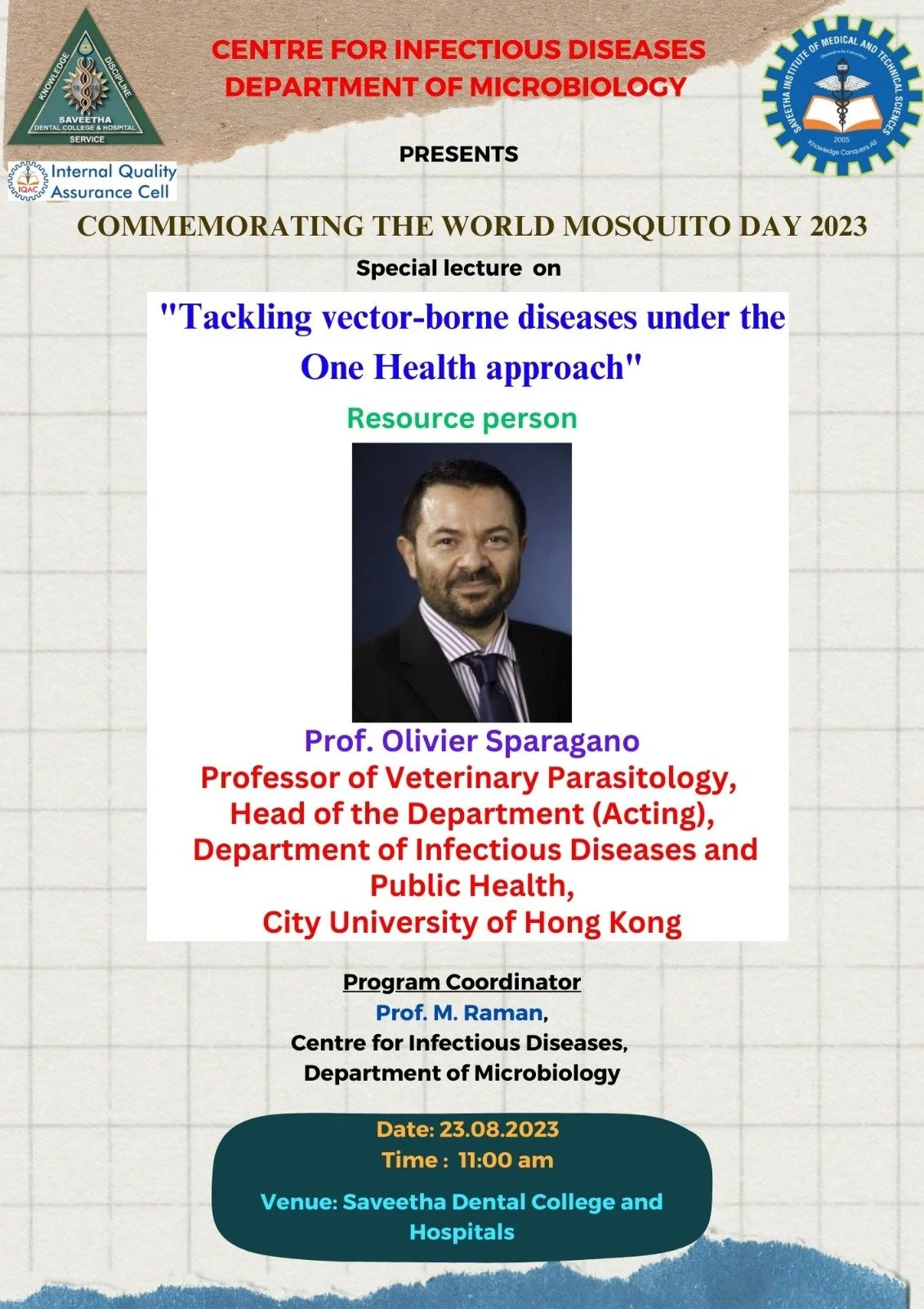 Commemorating The World Mosquito Day 2023 Aug 23 Written By Saveetha Microbiology Lecture on “Tackling vector-borne diseases under the One Health approach”, Prof.Olivier Sparagano, Professor of Veterinary parasitology, Head of the Department, Department of Infectious Diseases and Public Health, City University of Hong Kong Saveetha Microbiology
